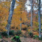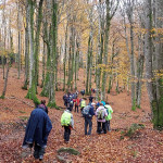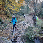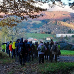 Dès le départ de la marche, nous avons dû remonter le village en passant par la ruelle de l’Amour puis par un sentier qui s’enfonçait progressivement dans la forêt. De belles hêtraies, encadraient le chemin rendu lumineux par la couleur des feuilles. Cela n’avait pas que des avantages car les belles feuilles qui jonchaient le sol masquaient par endroit des pierres, des branches, des racines qui étaient autant de pièges pour les randonneurs. Heureusement ils étaient tous vigilants ! Parfois des coupes de bois avaient dégagé des espaces qui permettaient d’admirer les belles couleurs d’automne de la vallée.