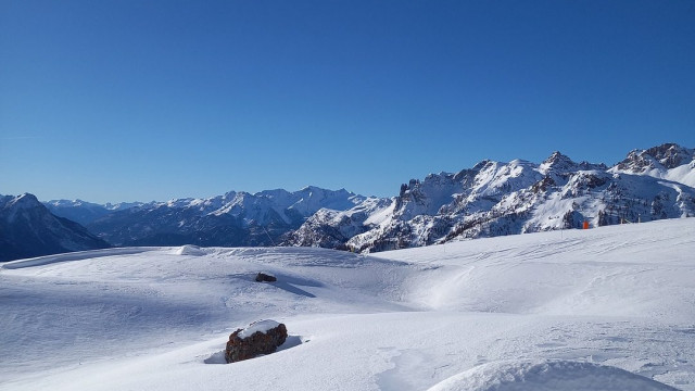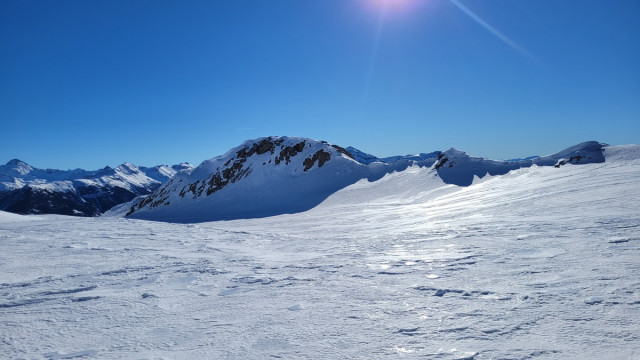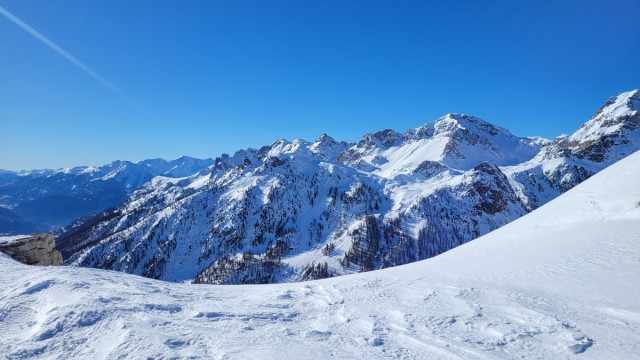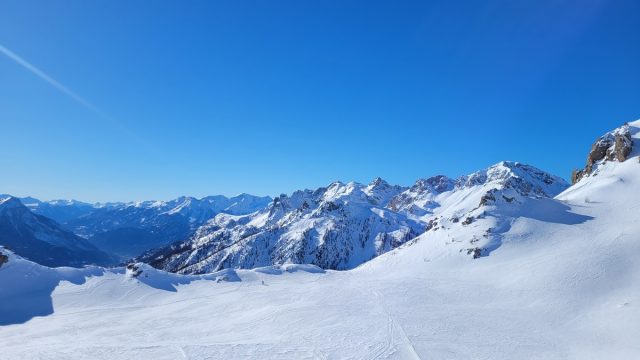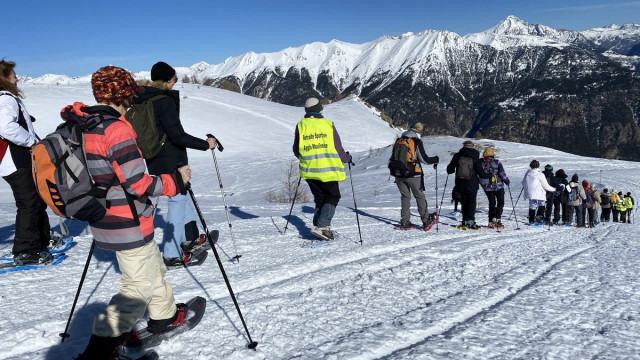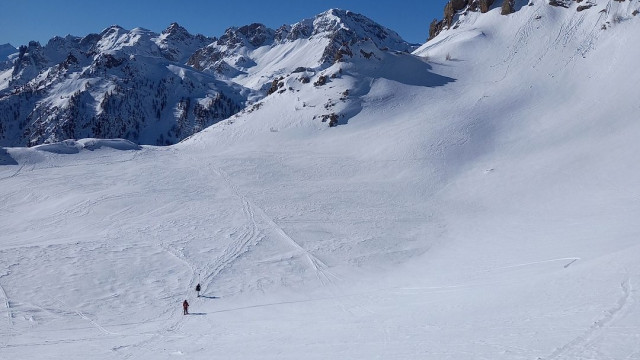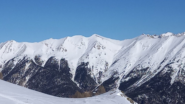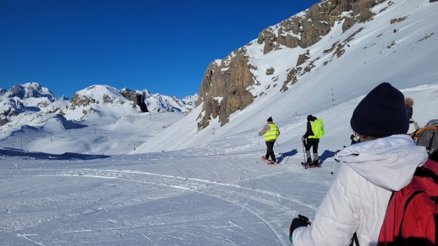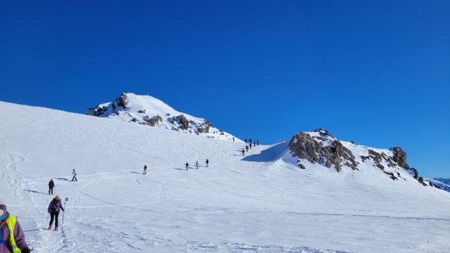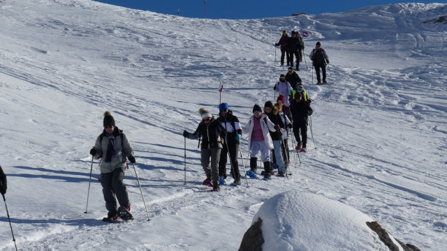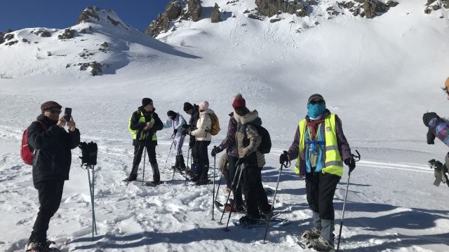 Des skieurs évoluaient sous un ciel bleu intense. Par une trace balisée de loin en loin par des petits drapeaux mauves, la chenille des « raquetteurs » prit la direction nord-ouest d’abord en descente puis par une montée parfois raide, elle arriva au col du Prorel à 2400 m d’altitude