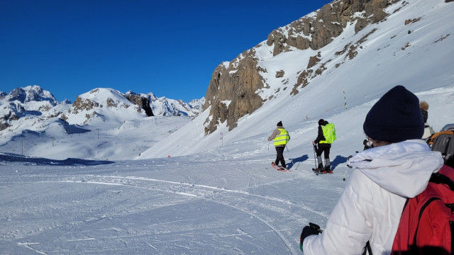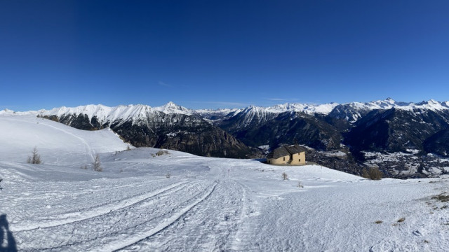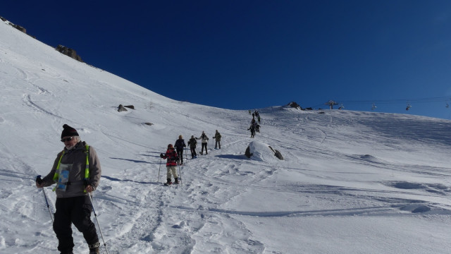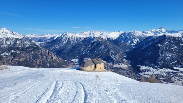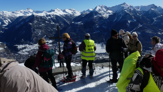 La trace devint plus difficile à suivre, mais avec des informations données par le personnel du site et les observations du terrain, le chemin fut trouvé. Après être passés à un point de vue sur la vallée de la Durance les « raquetteurs » s’orientèrent vers un restaurant d’altitude. Le pique-nique sorti du sac y fut apprécié, de même que les cafés, avant de prendre la direction de Notre-Dame des Neiges, chapelle qui domine Briançon à 2300 m d’altitude. Il ne restait plus qu’à remonter vers la gare de PROREL 2 sur une belle neige agréable.