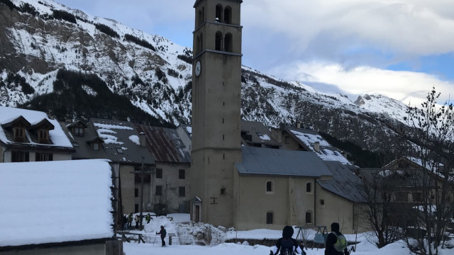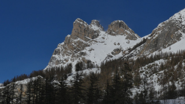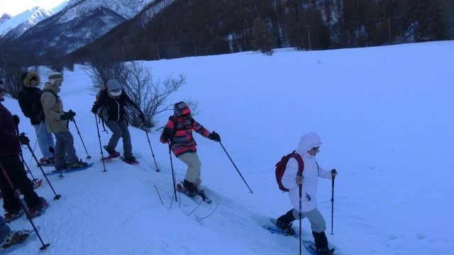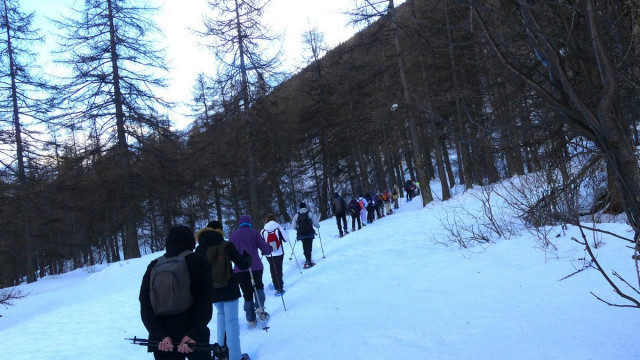 Matin : Pour remonter la vallée en raquettes, il fallait dépasser Villeneuve. Dominique nous conduisit jusqu’au parking de la patinoire à partir duquel des chemins qui servaient également de pistes de ski de fond nous permirent d’approcher les Guibertes, au bout de 3 kilomètres. Après une montée non damée vers la forêt le retour vers le bus permit d’avoir une vue un peu surplombante sur la vallée en direction de Briançon.