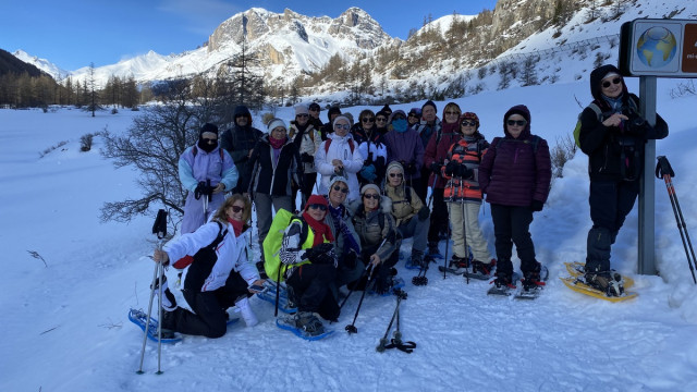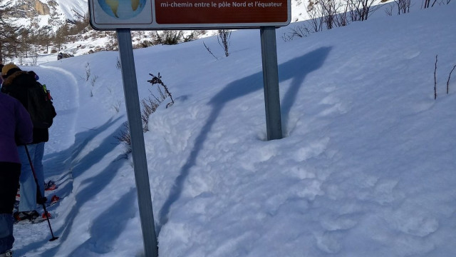Après-midi : Nous avons décidé d’aller plus en amont encore que le matin. Notre bus nous amena jusqu’au Casset, petit lieu-dit au-delà de Monétier-les-Bains en direction du Col du Lautaret. La traversée du village en raquettes, partiellement enneigée permit de voir de belles maisons haut-alpines. Juste après l’église et la traversée de la Guisane, le cheminement commença sur des chemins et de petites routes de montagne, sans avoir à traverser des champs cette année, jusqu’au hameau « Le fontenil », proche de « Les Boussardes ». Au passage nous avions passé le 45ème parallèle en direction du Pôle Nord ce qui avait provoqué de nombreuses prises de photos. Un petit pont permit d’aller sur l’autre rive de la Guisane et c’est par une trace non damée suivie à travers la forêt de mélèzes que nous sommes revenus au Casset. Certains ont pu participer à la 2ème visite de la distillerie.