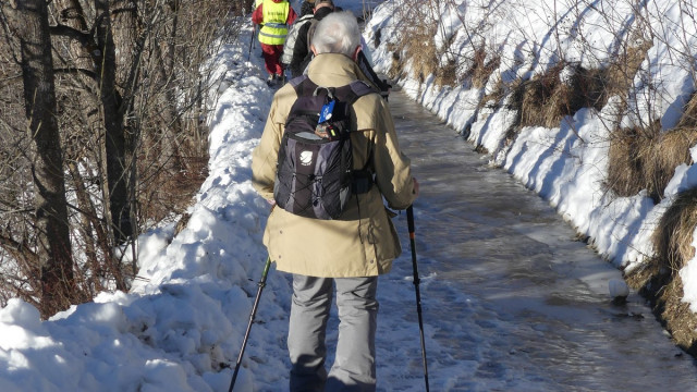 Après-midi : toujours sur la rive gauche de la Guisane, mais en aval du village, il fallut faire une marche d’approche jusqu’au-dessus de Chantemerle avant d’emprunter un sentier enneigé à peu près horizontal vers le torrent du Grand Verdarel dont on a ensuite remonté le cours. Ce torrent a connu des crues dévastatrices en 1981 et son lit a été aménagé pour en casser le débit. Nous avons pu voir ces aménagements. Le retour vers Le Villars Laté par un sentier en balcon a permis d’admirer le côté ubac de la montagne depuis Briançon jusqu’au Monétier-les-bains. Le groupe a profité de champs enneigés pour faire sa propre trace dans de la neige vierge, dans la colline et le long de la route pour rejoindre notre hébergement.