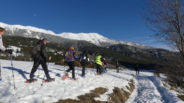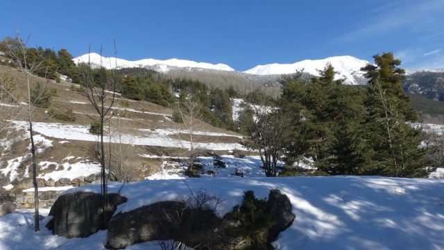 Matin : tout commença par le réglage du matériel, tâche indispensable, mais fastidieuse. Après un court départ sans raquettes, nous avons trouvé des chemins assez verglacés qui permettaient de monter au-dessus du village de Salles les Alpes jusqu’à un panorama sur la vallée en amont. La température était fraîche, le ciel dégagé montrait un bleu rendu profond par la neige immaculée sur les sommets. C’était une belle entrée en matière.