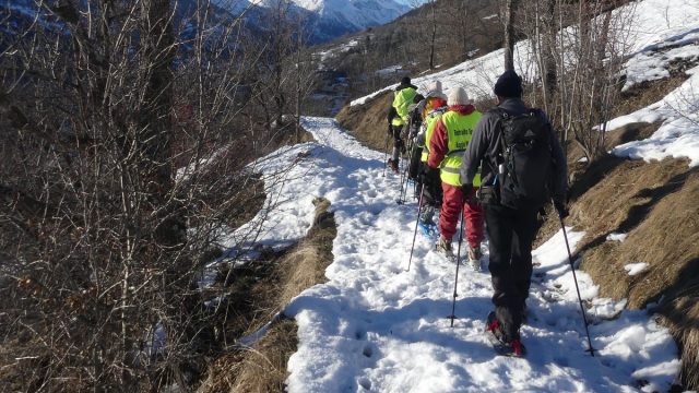 Après-midi : toujours sur la rive gauche de la Guisane, mais en aval du village, il fallut faire une marche d’approche jusqu’au-dessus de Chantemerle avant d’emprunter un sentier enneigé à peu près horizontal vers le torrent du Grand Verdarel dont on a ensuite remonté le cours. Ce torrent a connu des crues dévastatrices en 1981 et son lit a été aménagé pour en casser le débit. Nous avons pu voir ces aménagements. Le retour vers Le Villars Laté par un sentier en balcon a permis d’admirer le côté ubac de la montagne depuis Briançon jusqu’au Monétier-les-bains. Le groupe a profité de champs enneigés pour faire sa propre trace dans de la neige vierge, dans la colline et le long de la route pour rejoindre notre hébergement.