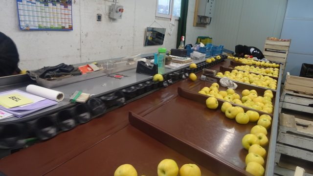 A la sortie de la chambre froide, les pommes sont lavées, le palox est alors plongé directement dans l’eau : les pommes flottent ce qui les empêche de se cogner. Ensuite elles sont brossées, séchées, passées dans la calibreuse (machine française). Chaque pomme est vérifiée manuellement : une petite talure elle sera vendue pour faire de la compote, plus talée, elle servira de nourriture pour les animaux.