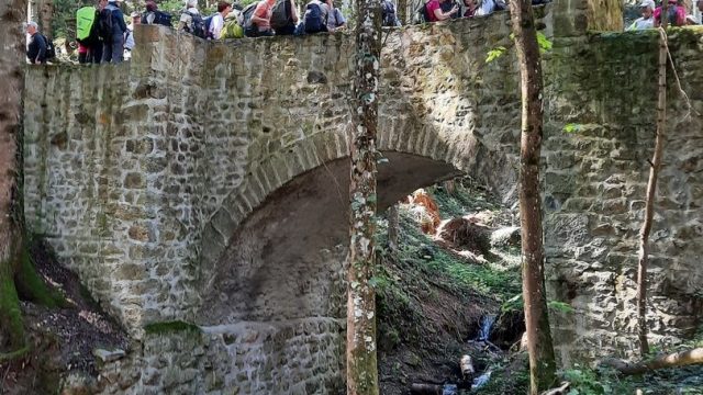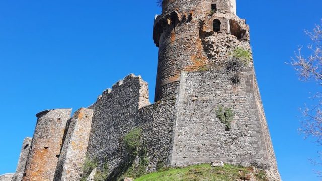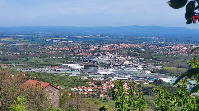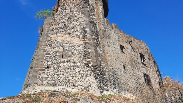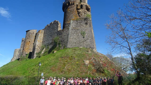 Nous quittâmes le GR 441 pour prendre un sentier très agréable qui déboucha bientôt sur une côte un peu raide mais courte avant de bifurquer pour longer les méandres d’un petit ruisseau et de le traverser par un pont de pierre. Le groupe s’y arrêta quelques minutes avant d’arriver au pied du château de Tournoël. De la plate-forme une vue plongeante sur les environs de Volvic, la plaine de la Limagne et l’usine d’embouteillage des eaux de Volvic s’offrit à nous. Au loin nous apercevions les monts du Forez.