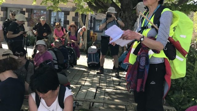 A l’arrivée à Volvic près des stades, le groupe finit de s’équiper et de prendre un encas avant de démarrer le parcours de 19 km de notre randonnée. Après avoir longé les abords des stades et gravi les marches en direction du centre-ville, le groupe arriva à l’église Saint Priest du 12ème siècle. Un premier arrêt fut proposé pour admirer sur le mur de l’ancienne école d’architecture, des tableaux gravés dans la pierre de Volvic représentant d’anciens métiers notamment le tailleur de pierre.
