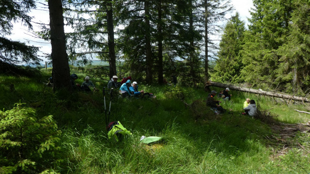 Pour aller au Lac du Pêcher le groupe rencontra un troupeau de belles vaches Salers qui l’obligea à sortir du sentier afin de ne pas le déranger. Sur le vaste plateau basaltique recouvert de belle herbe verte, les randonneurs cheminèrent au travers du massif forestier de la Pinatelle où partout les pins sylvestres « fleurissaient ». Des anémones pulsatiles, des gentianes printanières d’un beau bleu, mais aussi des grandes gentianes jaunes et encore des genêts, coloraient le paysage. Des portillons aménagés par les agriculteurs permettaient de progresser tout en maintenant les clôtures fermées.