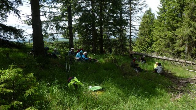 Vers 11h15 le bus s’immobilisa à La Boissonnière, point de départ de notre première randonnée. Après avoir suivi une petite route de campagne, le groupe s’engagea sur un beau chemin et bifurqua pour gravir le premier sommet du séjour : La Roche du Pic (1261 m).