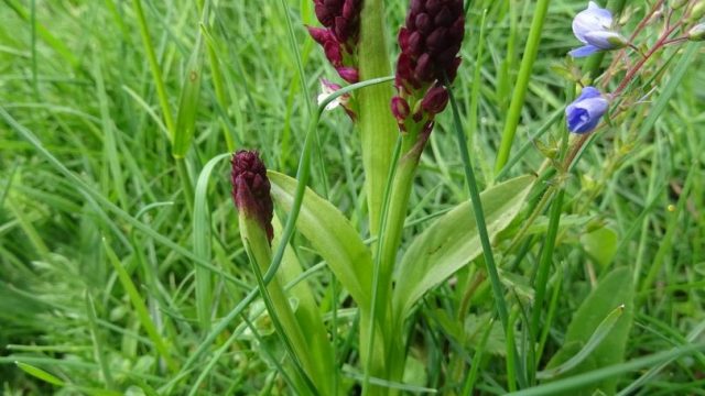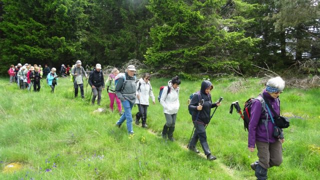 Pour aller au Lac du Pêcher le groupe rencontra un troupeau de belles vaches Salers qui l’obligea à sortir du sentier afin de ne pas le déranger. Sur le vaste plateau basaltique recouvert de belle herbe verte, les randonneurs cheminèrent au travers du massif forestier de la Pinatelle où partout les pins sylvestres « fleurissaient ». Des anémones pulsatiles, des gentianes printanières d’un beau bleu, mais aussi des grandes gentianes jaunes et encore des genêts, coloraient le paysage. Des portillons aménagés par les agriculteurs permettaient de progresser tout en maintenant les clôtures fermées.