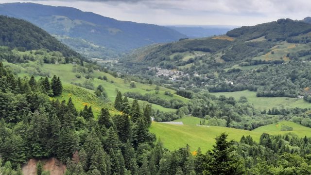 D’abord, il fallait situer ces massifs, au sud des monts Dôme, des monts Dore, du Cézallier et à l’Ouest de la Margeride, sans oublier l’Artense, c’est Bernadette qui s’en chargea. Les paysages montraient de beaux tapis où le vert cru des prairies se détachait des verts plus ou moins sombres des zones forestières en fonction des espèces végétales. Les genêts en fleur apportaient une touche colorée différente. L’ensemble formait de beaux tableaux que les photographes essayaient de saisir à travers les vitres du bus.