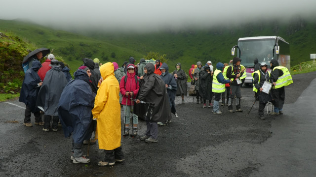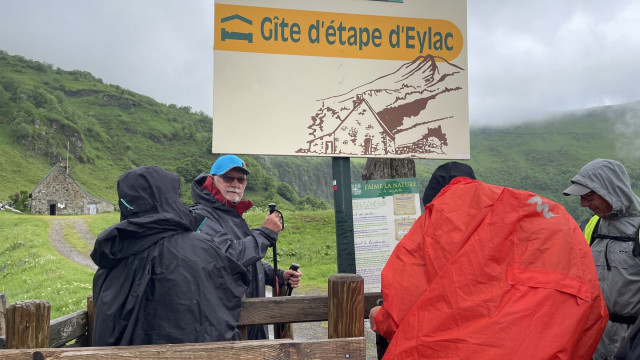 Mais arrivés au Pas de Peyrol nous sommes dans les nuages, le vent et la pluie qui persiste qui persiste… Après une attente de 30 minutes le staff se résout à redescendre pour passer sous les nuages. C’est au col d’Eylac que nous découvrons les vallées et commençons notre marche. Le GR4 (variante) nous mène jusqu’au Col de Serre, parfois sous les bourrasques mais toujours avec de beaux paysages. Nous y retrouvons avec plaisir notre car.
