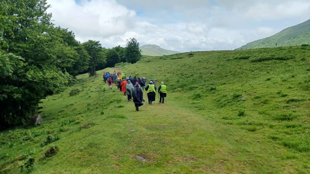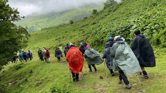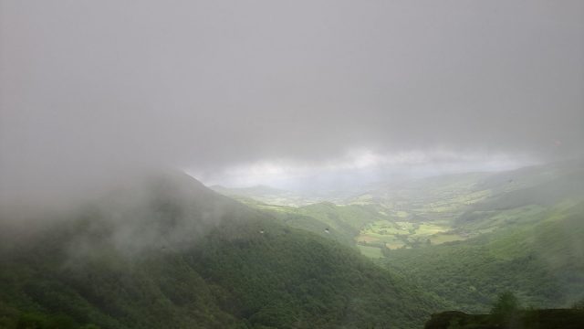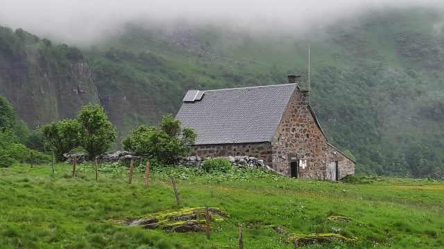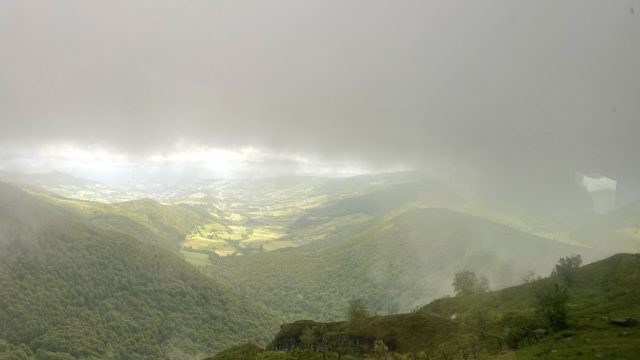 Mais arrivés au Pas de Peyrol nous sommes dans les nuages, le vent et la pluie qui persiste qui persiste… Après une attente de 30 minutes le staff se résout à redescendre pour passer sous les nuages. C’est au col d’Eylac que nous découvrons les vallées et commençons notre marche. Le GR4 (variante) nous mène jusqu’au Col de Serre, parfois sous les bourrasques mais toujours avec de beaux paysages. Nous y retrouvons avec plaisir notre car.