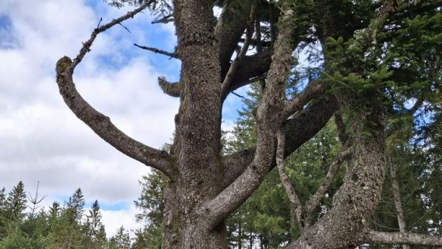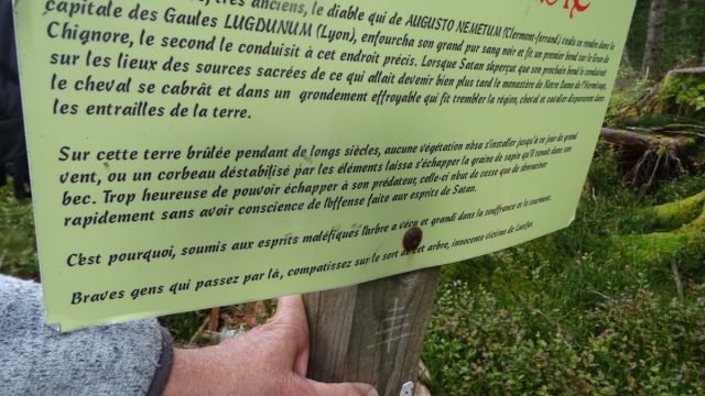 L’après-midi débuta par la descente d’un sentier dans la forêt avec des parcelles de coupes de bois, l’exploitation forestière étant une des principales activités de la région. Bientôt le groupe s’arrêta devant l’arbre du diable situé en bordure du chemin. Chacun put lire, sur un panneau explicatif à son pied, sa légende liée à Satan.
