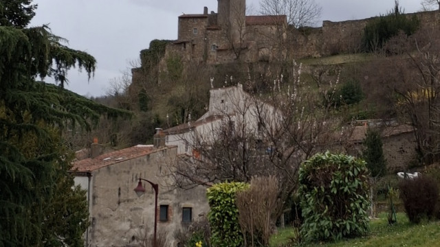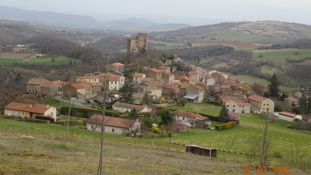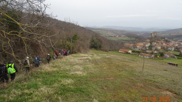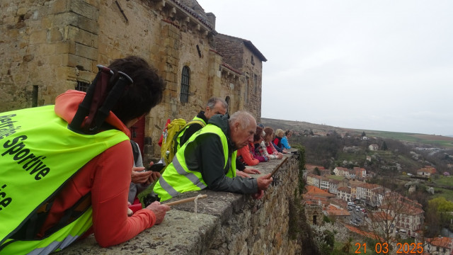 Comme chaque vendredi, le marché hebdomadaire était installé sur la place mais pas d’emplettes pour nos randonneurs. De là, par une rue montante ils prirent de la hauteur avec une vue plongeante sur le village et son château dont il ne reste qu’une tour et sa chapelle.