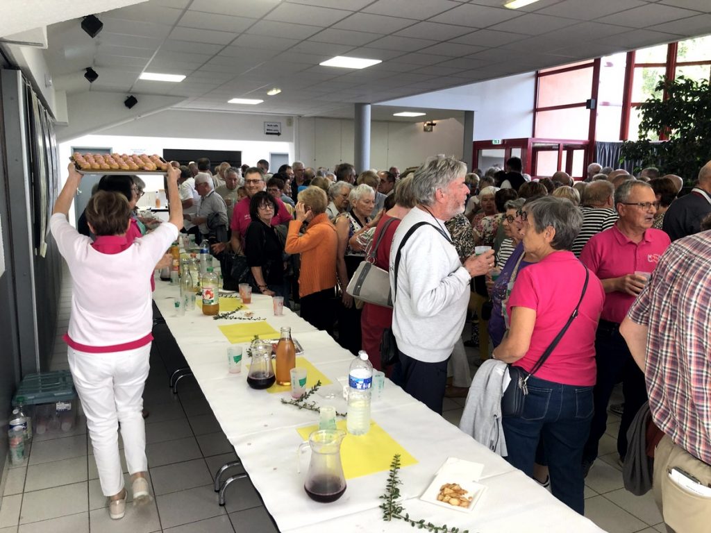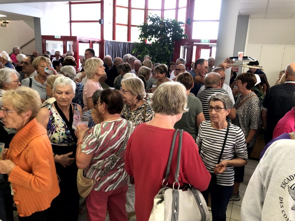 Tous les points inscrits à l’ordre du jour efficacement traités, en l’absence de questions diverses (pourquoi n’y en-a-t-il jamais ?) il était temps de remplir le hall d’entrée où un vaste buffet nous attendait. Admirez au passage la dextérité des serveuses et serveurs pour distribuer des viennoiseries très appréciées. C’était l’heure du goûter, et une AG, ça creuse.