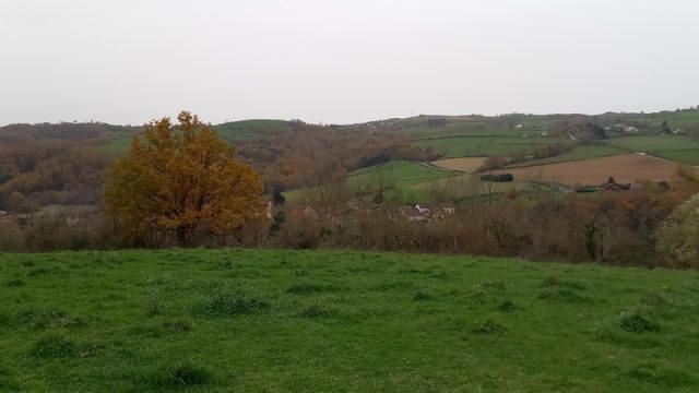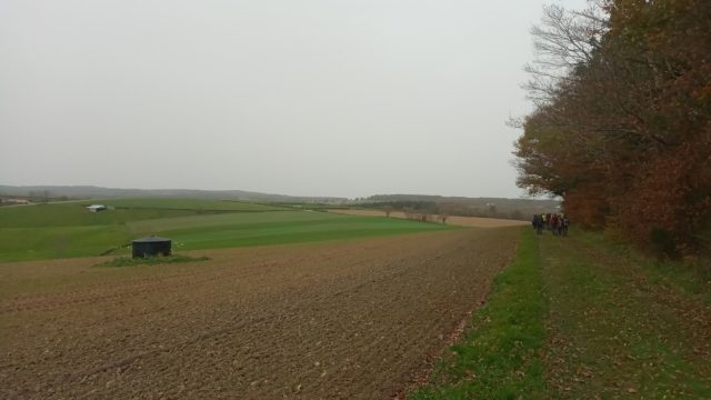 Il était 12h 30, la pause déjeuner fut proposée le long d’un sentier herbeux à l’abri du vent avec toujours un beau paysage automnal et des prairies bien vertes. En fin de repas des douceurs circulèrent pain d’épice de Michèle, chocolats… mais aussi des breuvages réconfortants.