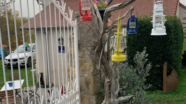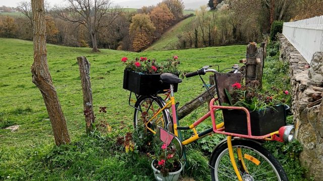 Puis les marcheurs prirent un peu d’altitude pour se trouver sur les hauts de Chouvigny. Nous étions presque à mi-parcours et le paysage était différent. Nous étions dans une zone de landes, de prairies avec de beaux panoramas sur les vallées et les monts environnants. D’ailleurs les hameaux traversés portaient les noms de petite Lande, grande Lande. A l’entrée de la petite Lande un gîte la grange de Jean attira tous les regards par sa décoration extérieure insolite : vélos, lampes, bibelots de toutes sortes.