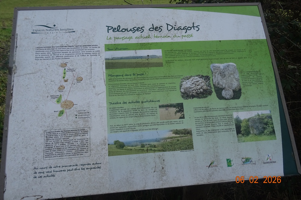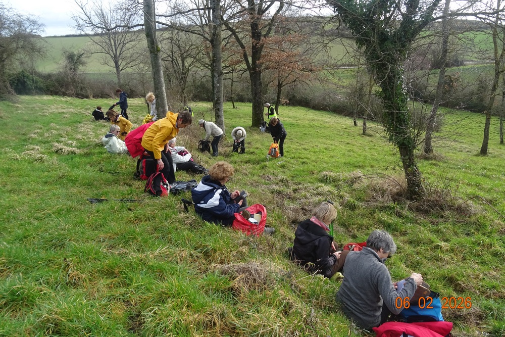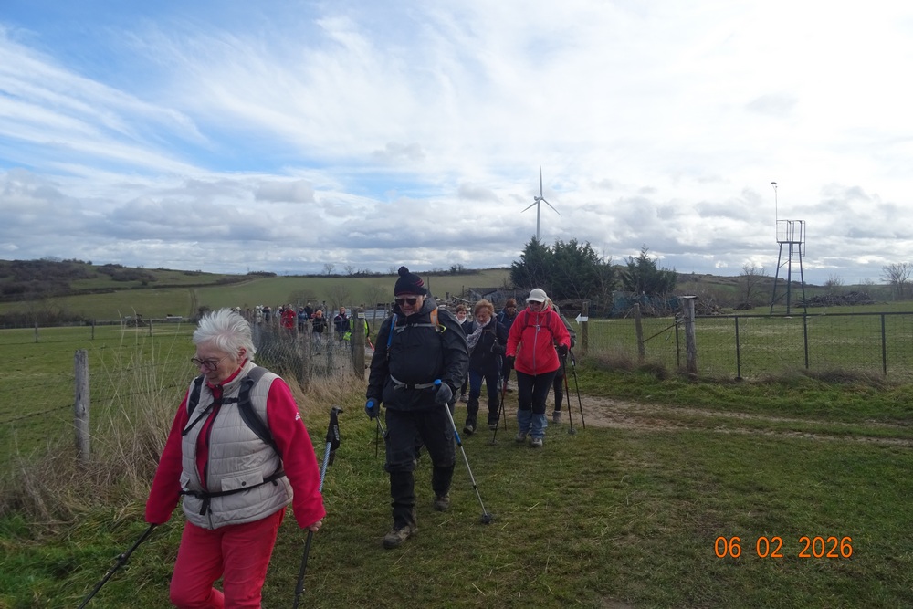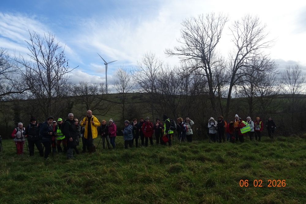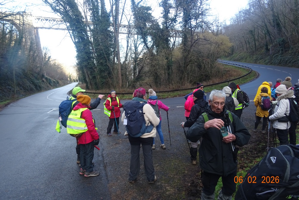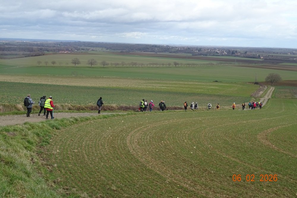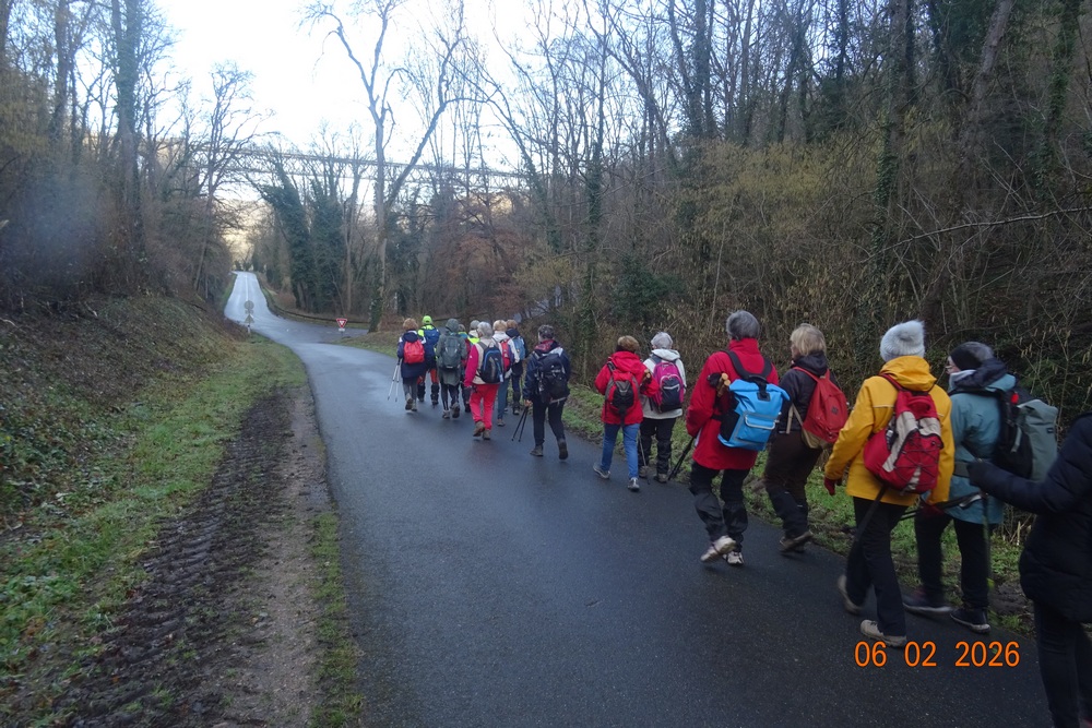 Par mesure de sécurité, le groupe de scinde en deux pour suivre la D 37 jusqu‘au pont. Après regroupement, le parcours emprunte le chemin longeant la voie ferrée, passe devant le Centre de Loisirs, traverse une route et nous amène à l’endroit de la pause déjeuner : bien que rudimentaire, chacun trouve une place à sa convenance ; adossés à un talus, nous profitons d’un beau panorama.
