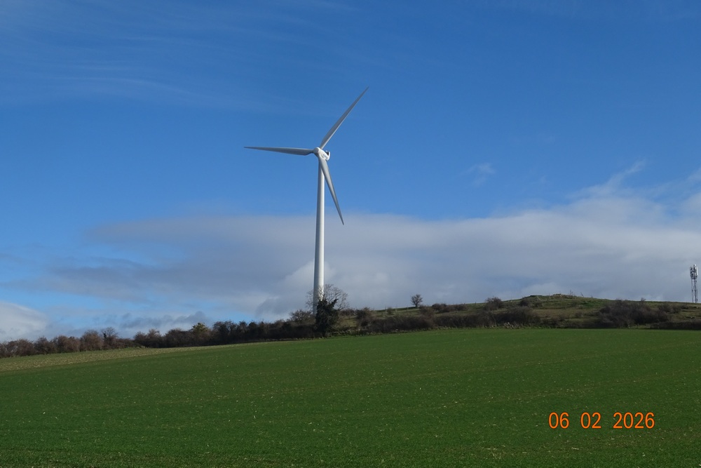 Nous coupons la D 216 et montons en direction de l’éolienne ; au sommet vu sur la Limagne, Saulzet et son château, les Monts de la Madeleine, le puy de Montoncel et les monts du Forez.