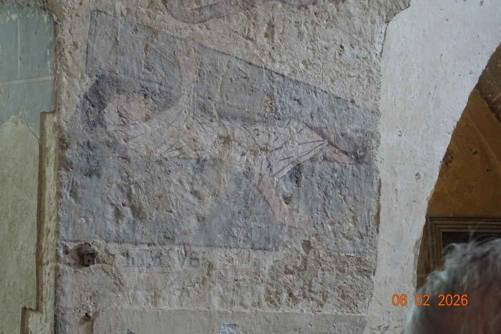 A l’intérieur, elle décrit les différentes peintures murales ; nous pouvons aussi voir un bénitier, un reliquaire, une statue Vierge à l’enfant, console peinte à blason …