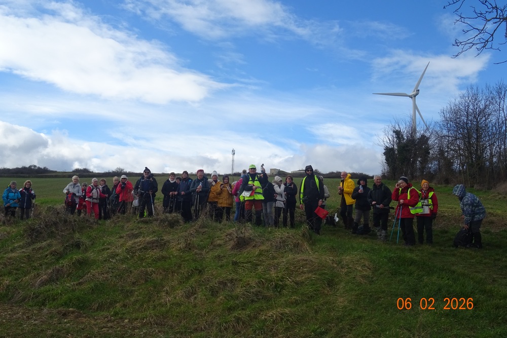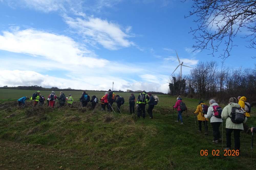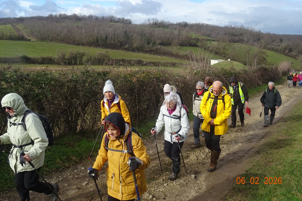 Par mesure de sécurité, le groupe de scinde en deux pour suivre la D 37 jusqu‘au pont. Après regroupement, le parcours emprunte le chemin longeant la voie ferrée, passe devant le Centre de Loisirs, traverse une route et nous amène à l’endroit de la pause déjeuner : bien que rudimentaire, chacun trouve une place à sa convenance ; adossés à un talus, nous profitons d’un beau panorama.