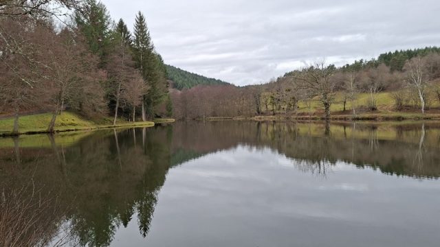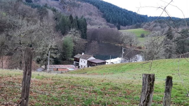 Nous poursuivons notre marche sur ce sentier, la météo s’améliore. Ce sentier forestier est caillouteux, boueux et parfois très abrupte. Merci les bâtons ! Petite pause après la montée, on enlève quelques vêtements, on grignote et on boit, prêts pour repartir. Encore une dernière côte avant de sortir de la forêt, on peut apercevoir le hameau des Murs du Temple. Arrivant près d’une route très passagère, nous donnons des consignes précises pour cheminer en file indienne. La vue est dégagée, on peut apercevoir la Chaine des Puys. Cependant il fait beaucoup plus frais avec un peu de vent et la pluie se réinvite. Nous sortons de la route pour descendre vers l’étang de Malforêt.