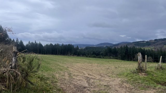 Ce lieu très bucolique et très reposant, mérite une pause pour contempler et faire des photos. A cet endroit se trouve un panneau indiquant d’un côté l’Allier et de l’autre le Puy de Dôme. Nous reprenons le sentier qui devient plus abrupte, les organismes commencent à être affectés. Le ciel est plus dégagé, la vue sur la prairie, les Bois Noirs et la chaine des Puys attire nos regards.