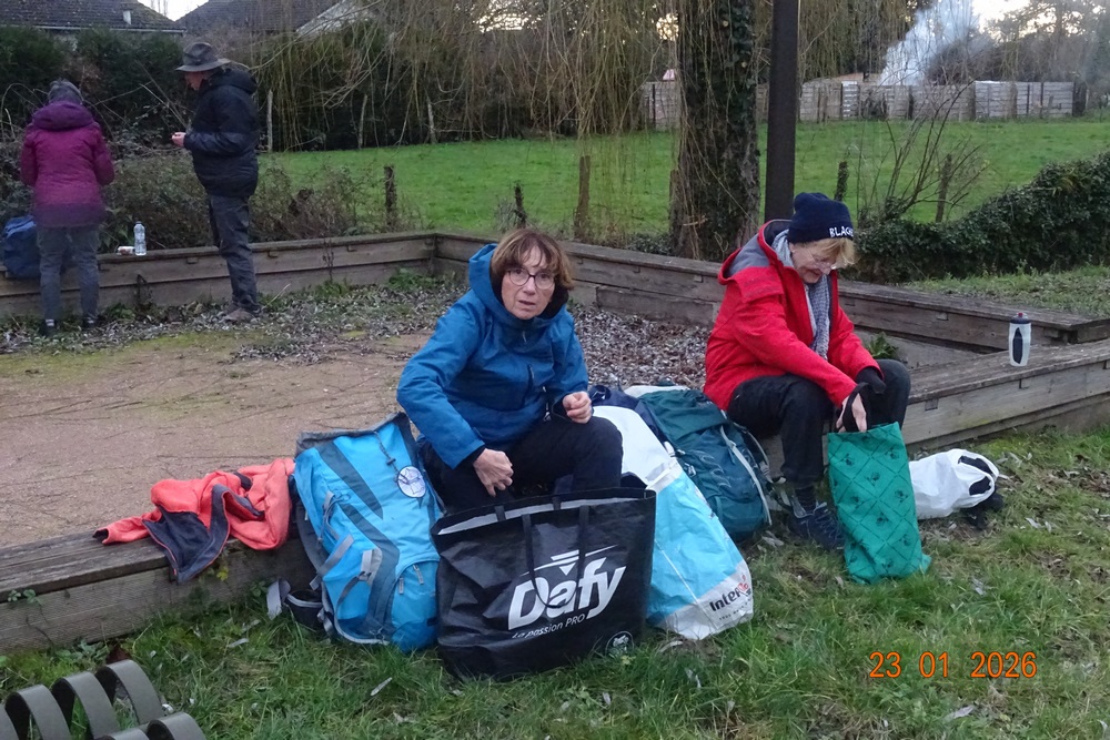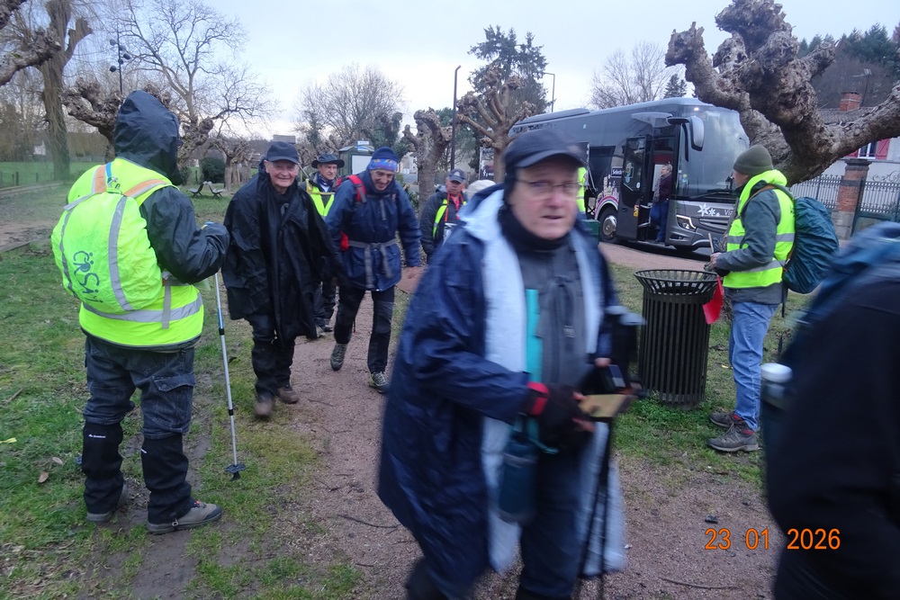 Après une heure trente de route, notre bus conduit par Maryline, nous dépose près d’un square où se trouve des bancs très pratiques pour finir de se préparer et de prendre un petit encas avant de partir. Certains enfilent la cape le ciel est un peu chargé et une petite pluie fine commence de tomber.