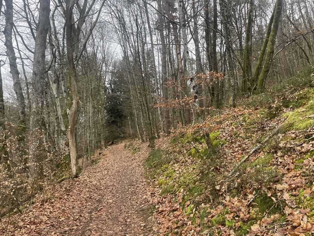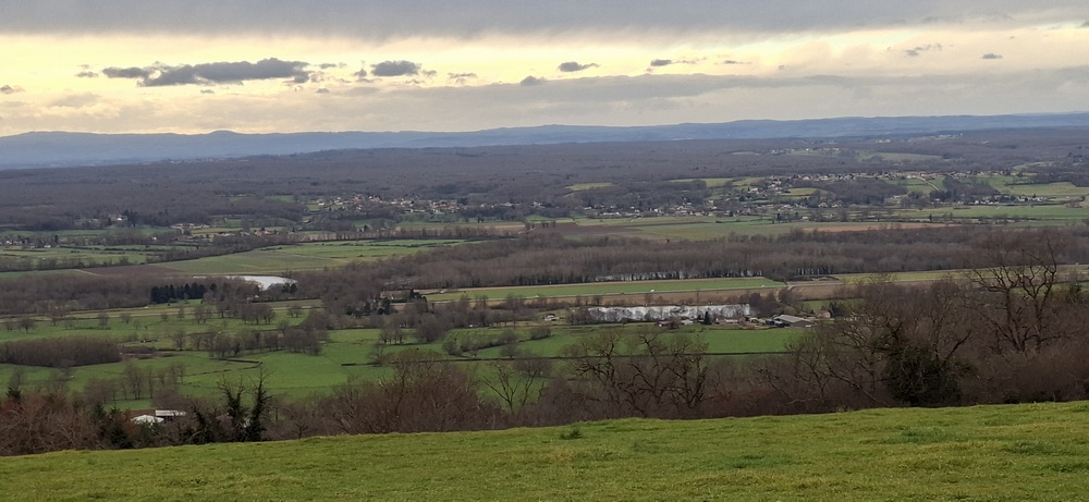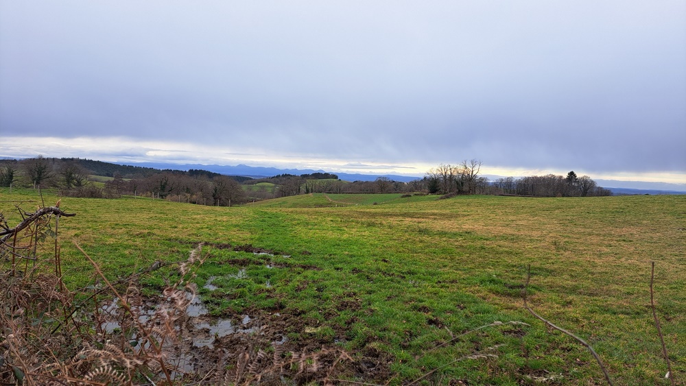 Nous continuons sur le GR 465, nous traversons les hameaux des Nérons et des Grenettes. Nous prenons la direction des Blettières. Sur le plateau belle vue sur le Val d’Allier avec en arrière-plan la Chaine des Puys. Nous continuons sur des chemins et des sentes forestières plus pentus, plus glissants, merci encore les bâtons !