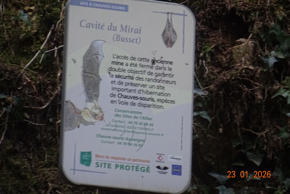 Par la route nous rejoignons un sentier forestier. Nous suivons le ruisseau du Darot pendant 6 km. Sur le chemin, nous nous arrêtons près de la cavité du Mirai. A cet emplacement se trouvait, il y a quelques années, une mine de fluorine. Maintenant elle abrite une importante colonie de chauve-souris. Ce site est classé Natura 2000. Lors de notre passage une personne était sur place pour effectuer le comptage de la colonie.