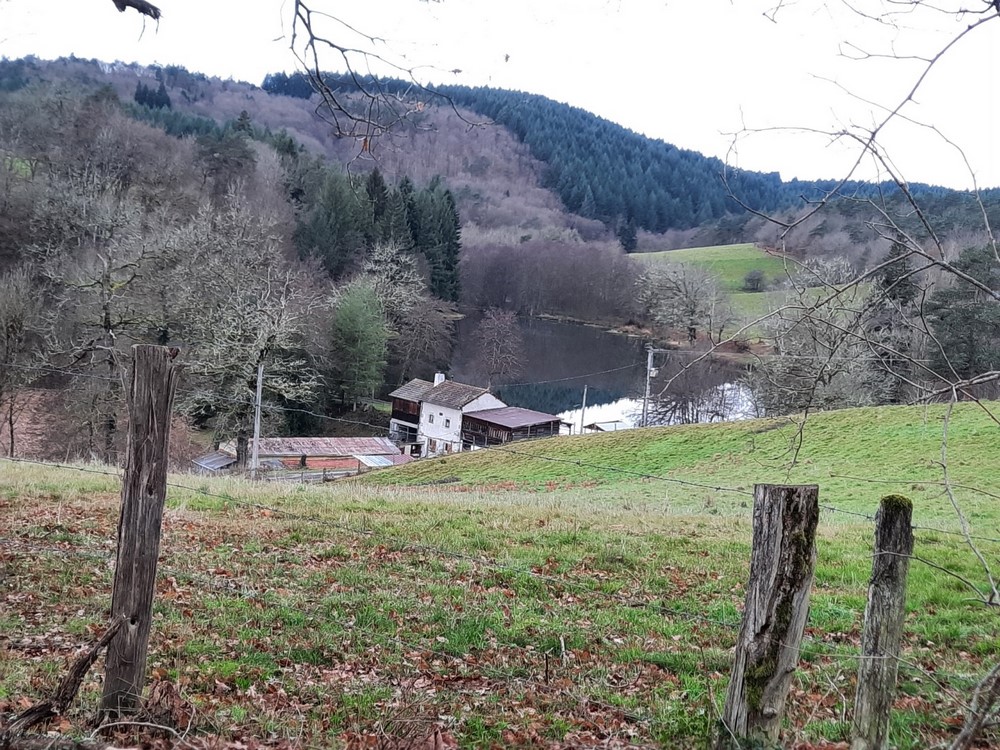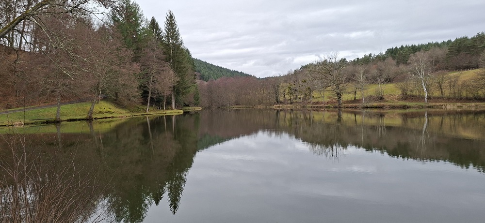 Nous poursuivons notre marche sur ce sentier, la météo s’améliore. Ce sentier forestier est caillouteux, boueux et parfois très abrupte. Merci les bâtons ! Petite pause après la montée, on enlève quelques vêtements, on grignote et on boit, prêts pour repartir. Encore une dernière côte avant de sortir de la forêt, on peut apercevoir le hameau des Murs du Temple. Arrivant près d’une route très passagère, nous donnons des consignes précises pour cheminer en file indienne. La vue est dégagée, on peut apercevoir la Chaine des Puys. Cependant il fait beaucoup plus frais avec un peu de vent et la pluie se réinvite. Nous sortons de la route pour descendre vers l’étang de Malforêt.