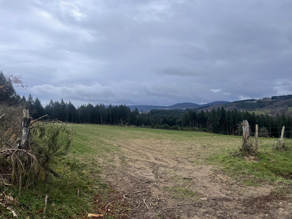 Ce lieu très bucolique et très reposant, mérite une pause pour contempler et faire des photos. A cet endroit se trouve un panneau indiquant d’un côté l’Allier et de l’autre le Puy de Dôme. Nous reprenons le sentier qui devient plus abrupte, les organismes commencent à être affectés. Le ciel est plus dégagé, la vue sur la prairie, les Bois Noirs et la chaine des Puys attire nos regards.