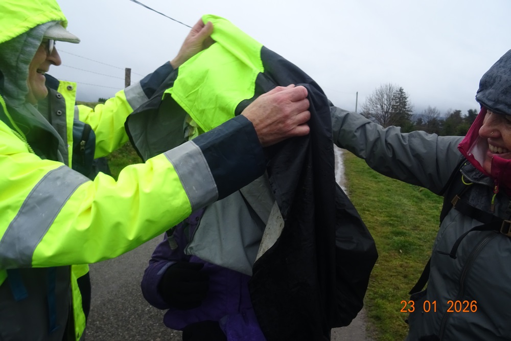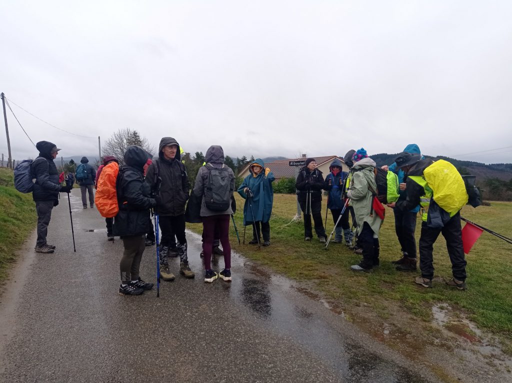 Ensuite nous nous dirigeons vers le Riboulet pour notre pause repas. Malheureusement ce gros nuage qui nous suivait lâche une grosse averse et le repas fut vite avalé. La pluie cesse, les capes se retirent. Pas toujours facile mais une aide bienveillante est toujours là. Nous marchons rapidement pour nous réchauffer, le soleil fait de timides apparitions