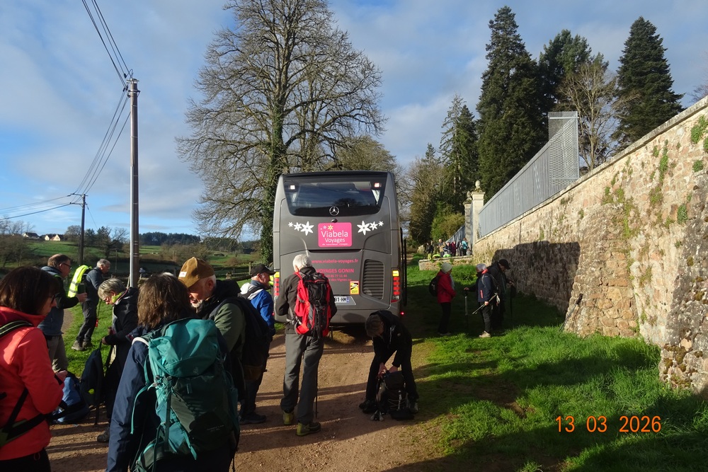 A 8h10, le car arrivait au pied du château de Terreau pour déposer le groupe. Les animateurs assurèrent la sécurité à la descente du bus et une fois les marcheurs équipés de leur sac à dos et de leurs bâtons, la rando pût démarrer.