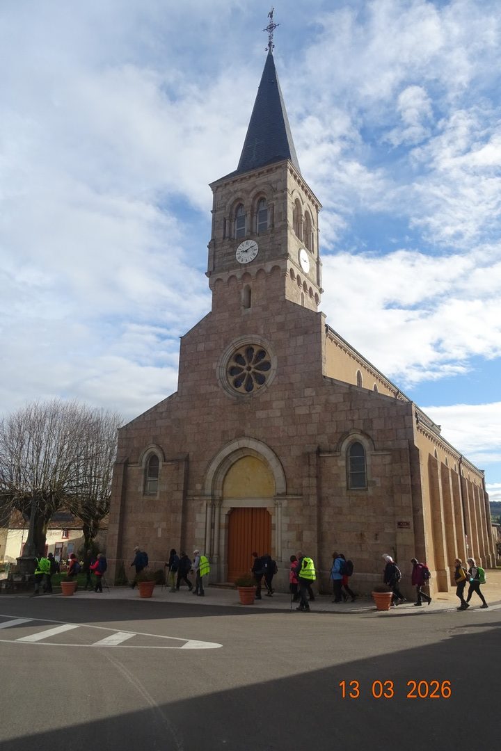 Après avoir longé deux beaux étangs et traversé le pont sur la N79, le groupe arriva à Verosvres où la visite de l’église fut proposée. Le bus nous attendait sur la place de la mairie et après la séance d’étirements faite par Jocelyne, les marcheurs prirent place dans le bus pour le retour où les chocolats de Pâques circulèrent durant le trajet.