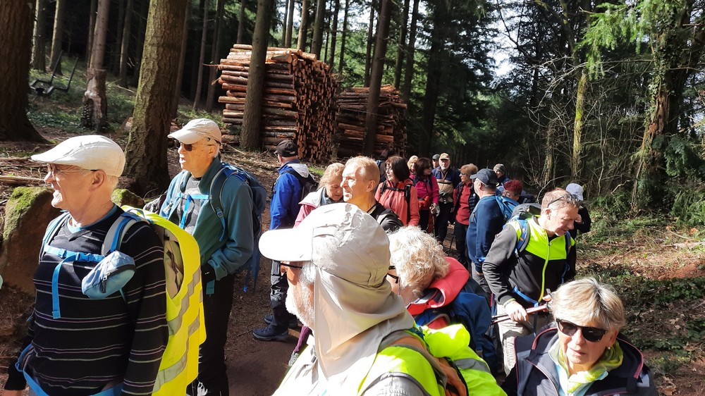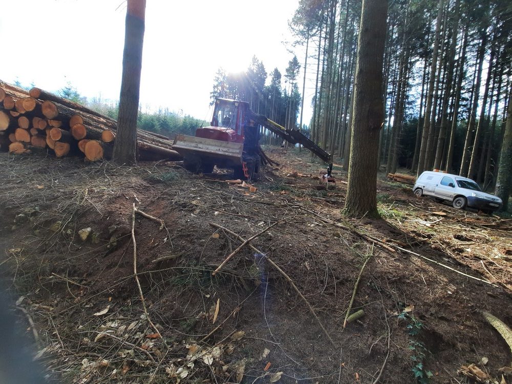 Puis, c’est par un sentier herbeux avec de belles vues sur le bocage avec ses prés verts entourés de haies bien taillées caractéristique de la région, que le hameau de « bel air » fut atteint. Le soleil commençait à chauffer malgré quelques petits cumulus qui ourlaient l’horizon. Les marcheurs entrèrent dans une forêt où les travaux forestiers les intéressèrent.