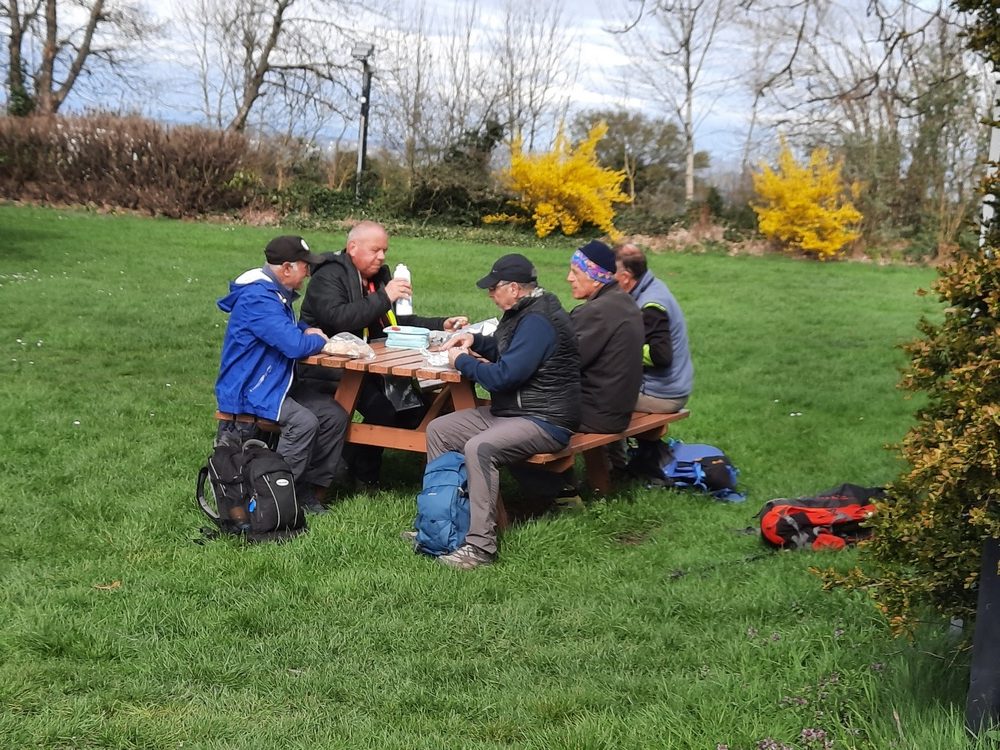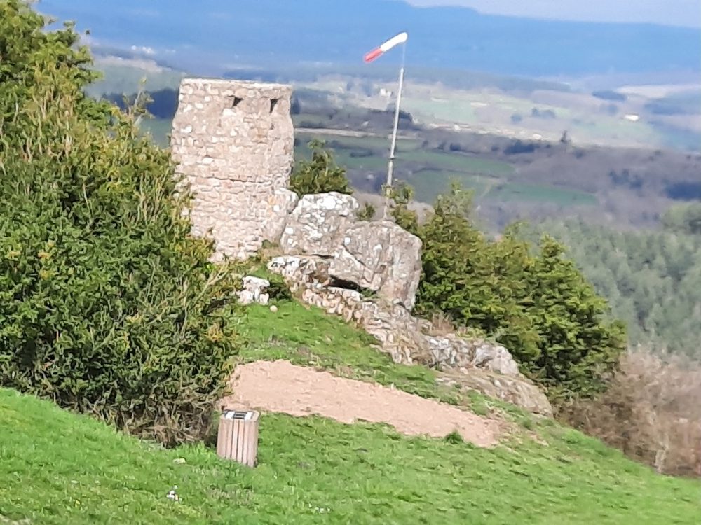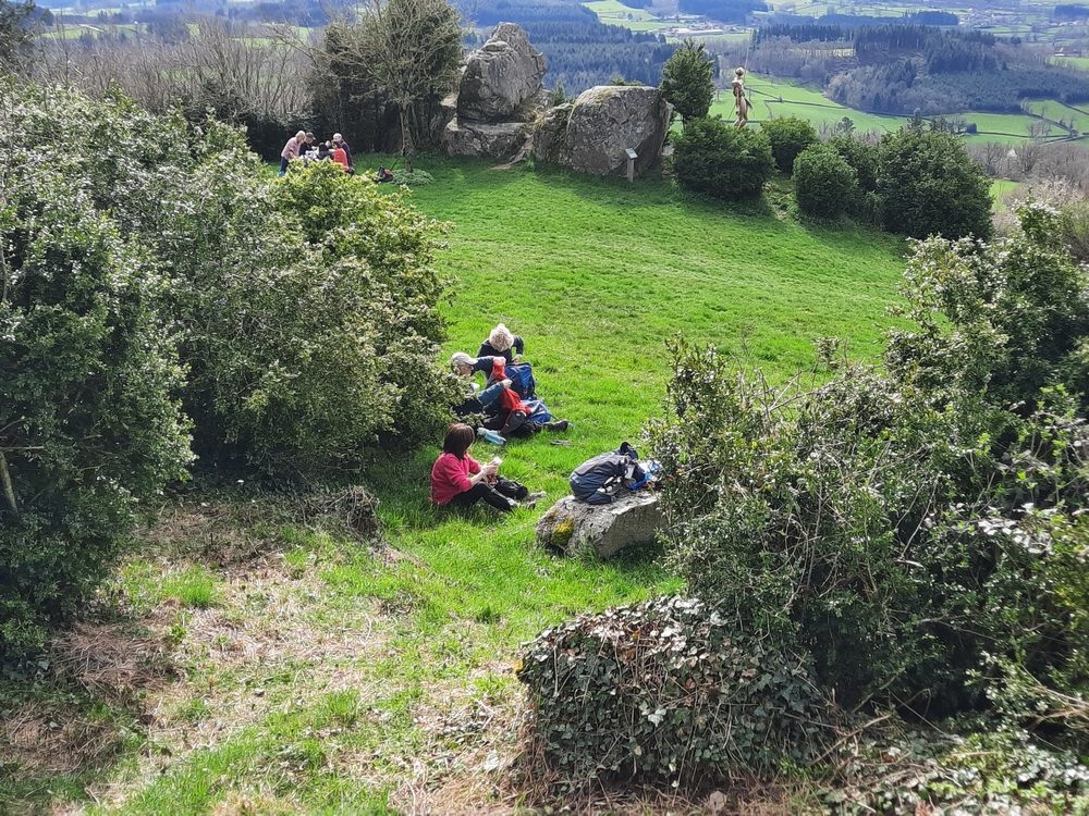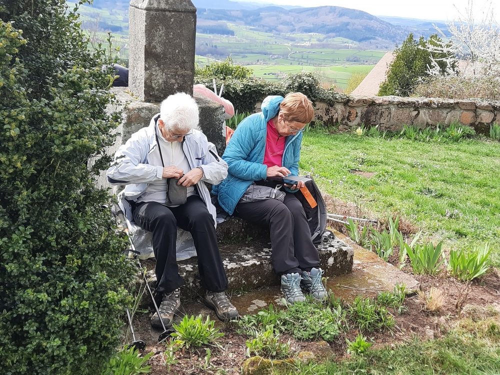 Treize heures sonnaient au clocher de l’église de Suin quand le groupe atteignit la butte, point culminant de la journée à 600 m. Le lieu était bien équipé de tables, bancs et murets et nos randonneurs s’éparpillèrent pour trouver une place pour déjeuner au soleil qui était à son zénith. Un bon moment de convivialité où, comme de coutume, gâteaux, friandises… circulèrent.