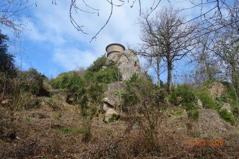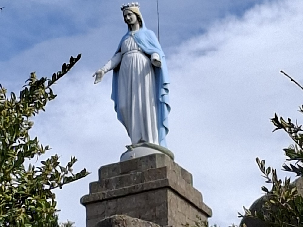 Le sommet de la butte Suin est couronné par une statue de la Vierge. A ses pieds se trouve la séparation des eaux entre Atlantique et Méditerranée marquée par des pierres plates peintes en bleu.